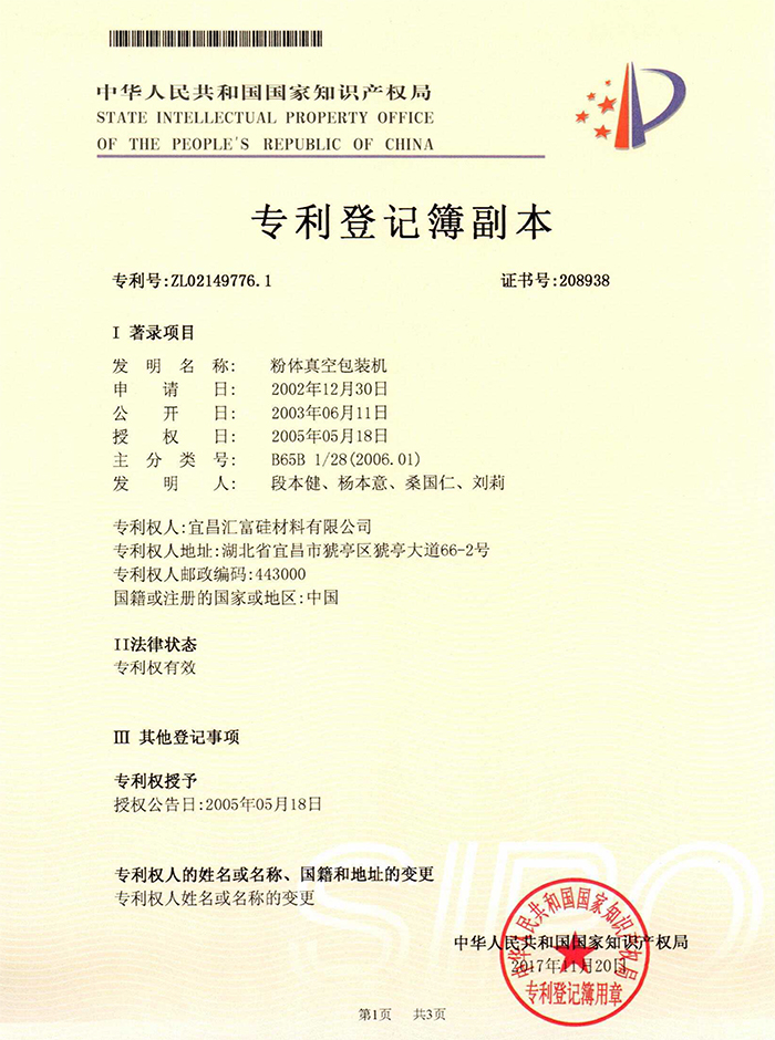 首页 научные исследования монопольная техника Patent Certificate for Powder Packaging Vacuum Machine 2021-03-15 11:25:31 点击: